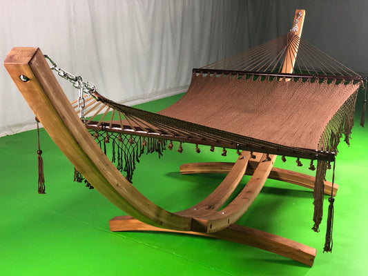 14 Ft. Teak Stain Wooden Arc Hammock Stand & Deluxe Hand Woven Bohemian Chic Rope Hammock Bed.